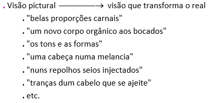 3.ª) A transfiguração do real (que foi desencadeada pelo “cobre lívido, oxidado” caindo sobre as “faces duns alperces” – estr. 6, vv. 4-5), essa fuga para o fantástico não significa um abandono do real, mas sim atribui uma visão mais ampla dos seus aspectos essenciais, conseguida através da transformação de sensações em imagens. Deste modo, dos frutos e legumes nasce a imagem das várias partes de um gigantesco corpo natural, simbólico do campo: prevalecem os substantivos, a adjectivação sugestiva [“túmido”, “fragrante”, est. 11, v. 3; “(...) vívida, escarlate”, est. 12, v. 3; “(...) hirtos, rubros”, est. 12, v. 5], o verbo expressivo em Bóiam aromas, fumos de cozinha” (est. 8, v. 1); existem enumerações (est. 10-11), elipses (est. 9, vv. 5; est. 10, vv. 4-5), comparações (“túmido”, “fragrante, / Como de alguém que tudo aquilo jante, / Surge um melão, que me lembrou um ventre”, est. 12, vv. 3-5; “E como um feto”, est. 12, v. 1); hipálage (“E às portas, uma ou outra campainha / Toca, frenética, de vez em quando”, est. 8, vv. 4-5); e metáforas [“(...) verdes folhos”, est. 10, v. 2; “São tranças dum cabelo (...)”, est. 10, v. 3; “E os nabos – ossos nus”, est. 10, v. 4; “E os cachos de uvas – os rosários dos olhos”, est. 10, v. 5].